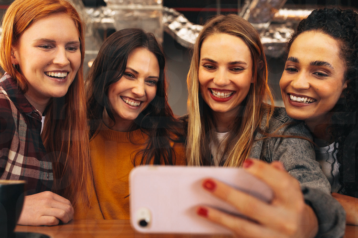 Group of women sitting at cafe and taking selfie with mobile phone. Woman sitting with friends at coffee shop making a selfie.