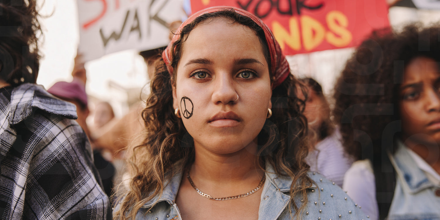 Marching for world peace. Young teenager looking at the camera with the symbol of peace painted on her face. Group of young people protesting with anti-war posters in the city.