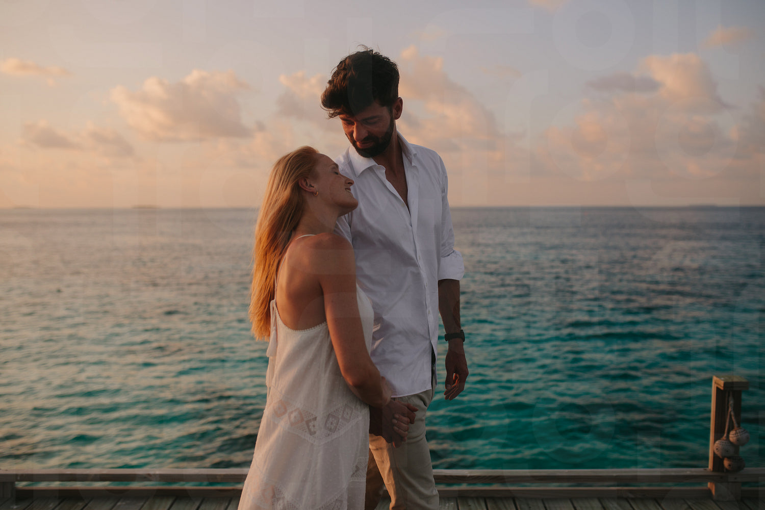 Couple on a romantic holiday at the sea. Couple walking together near the sea holding each other.