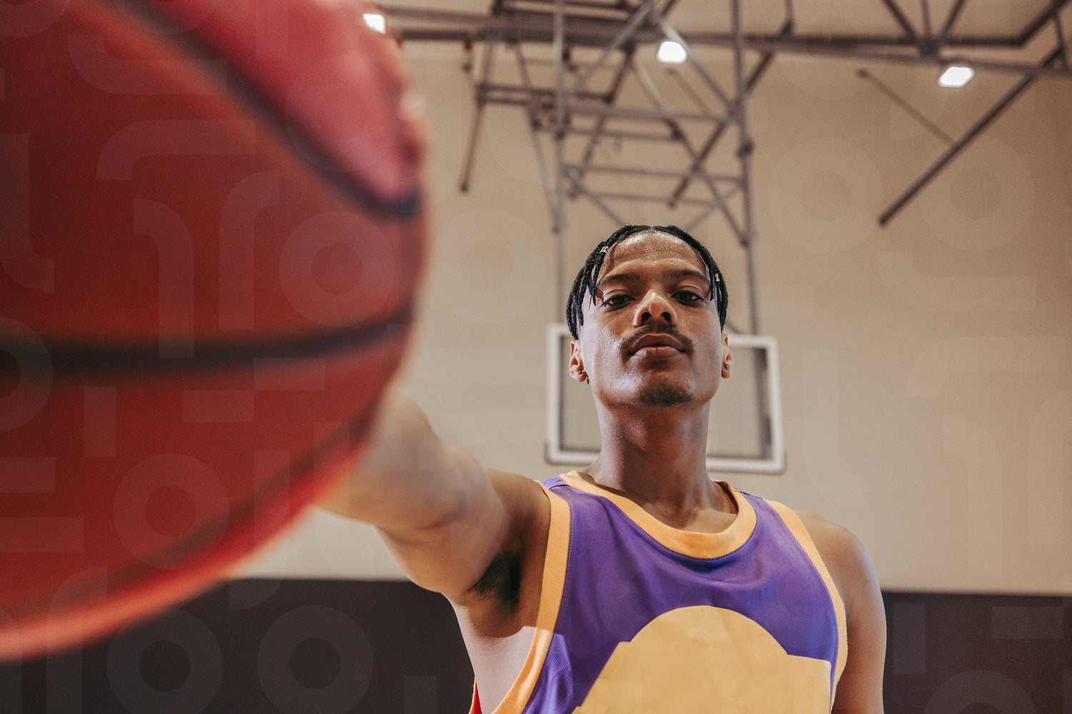 Confident young man in sportswear holding a basketball close to the camera inside a basketball court, conceptualizing determination, athleticism, and dedication in a modern sports setting.
