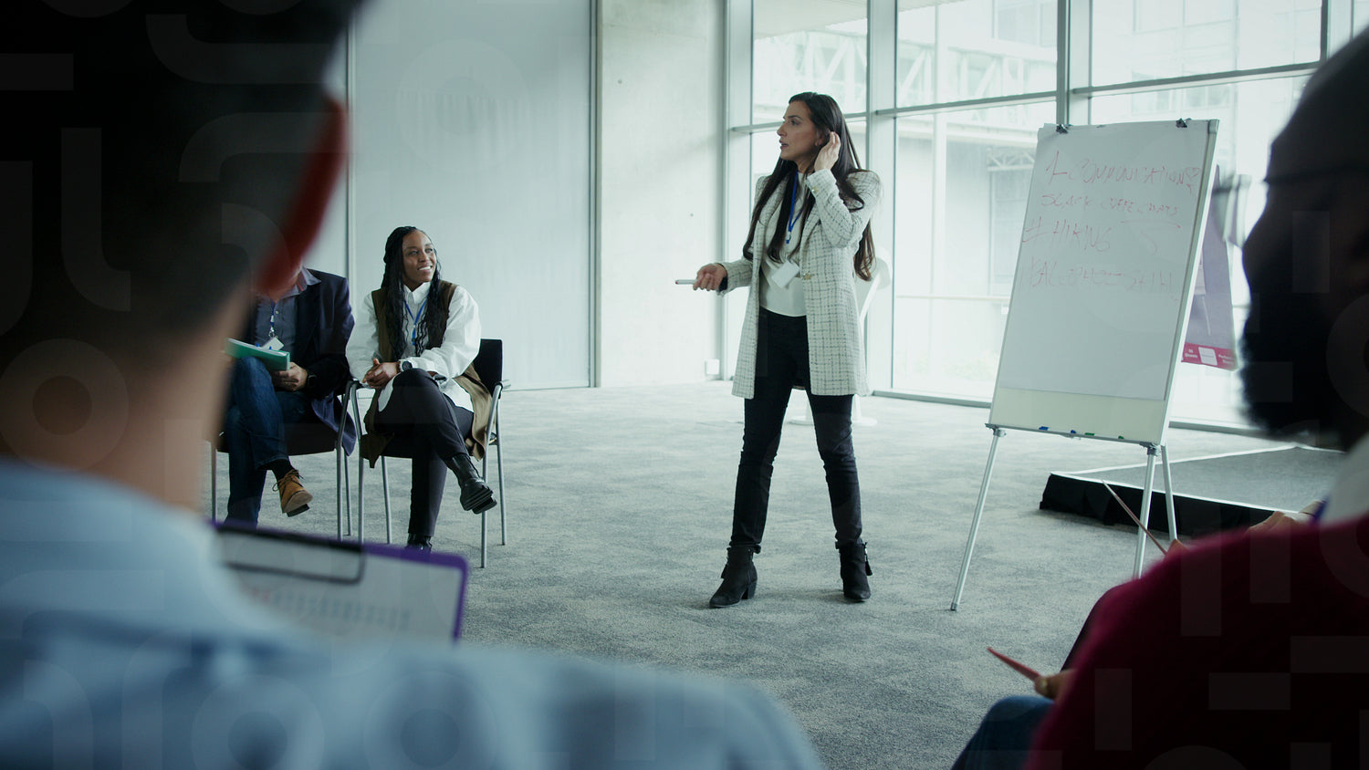 A businesswoman confidently addresses a group of attendees during a corporate meeting. They are engaged in learning and collaboration at a professional event.