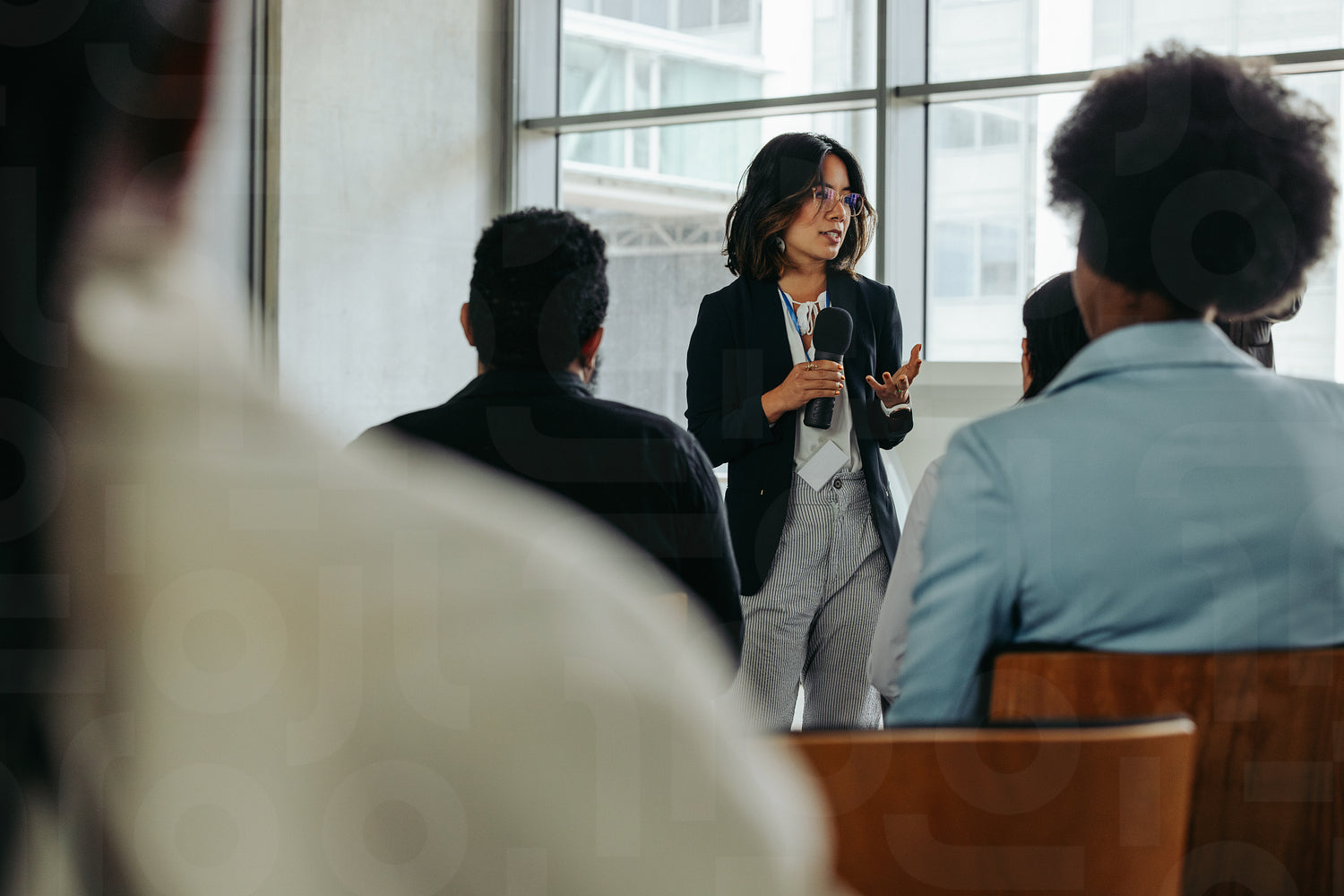 Businesswoman presenting in modern office to coworkers during a meeting