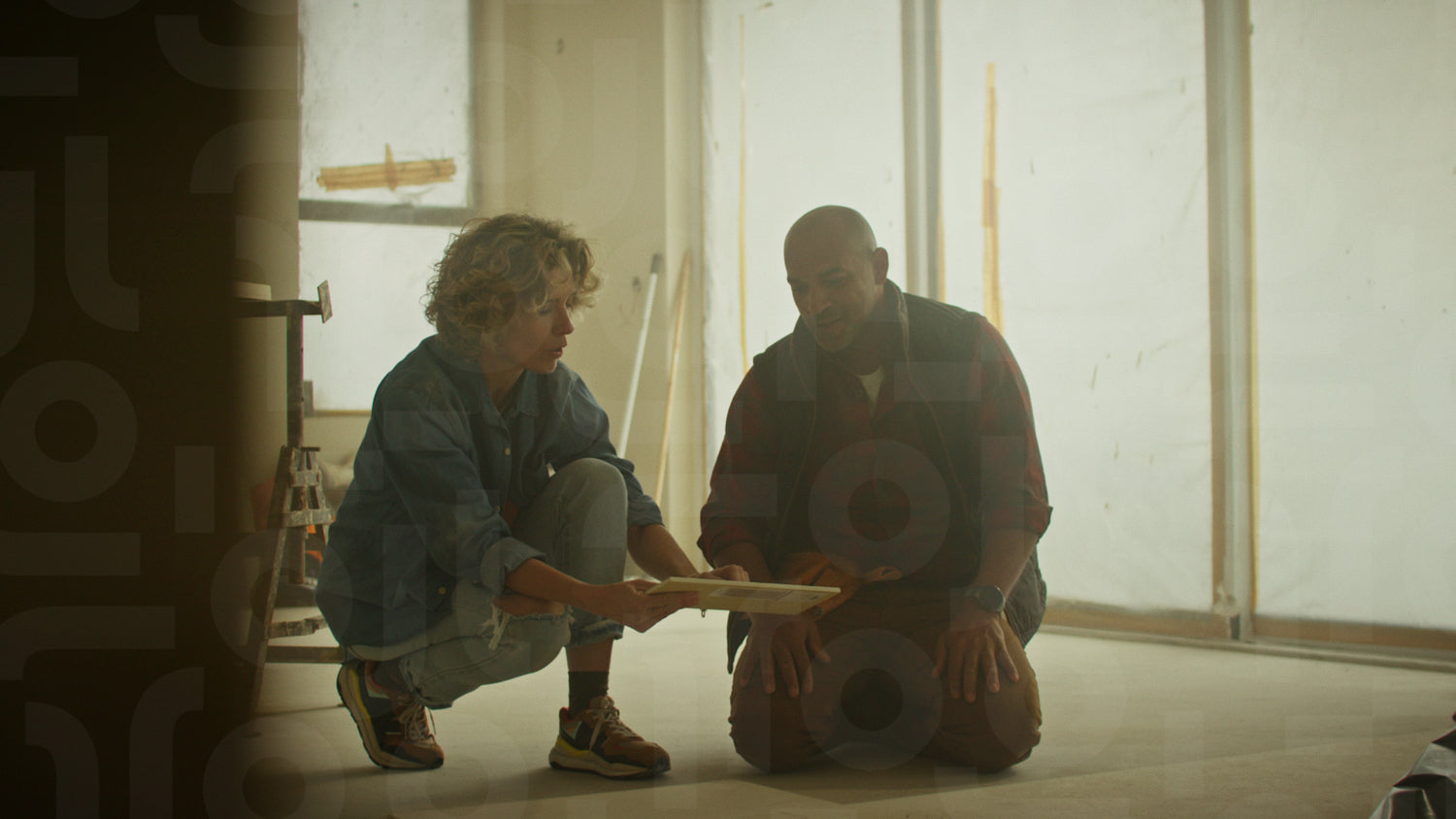 A middle-aged woman and man discuss home renovation plans, examining tiles in a partially finished room. The scene conveys planning and decision-making.