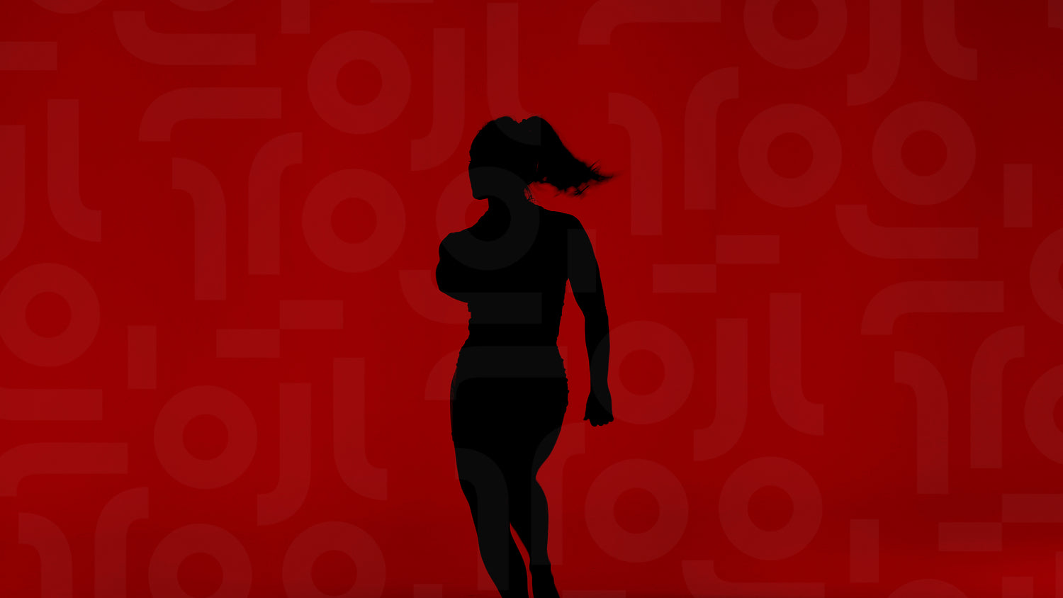 Dynamic dance performance by a powerful woman silhouette against a vibrant red studio background