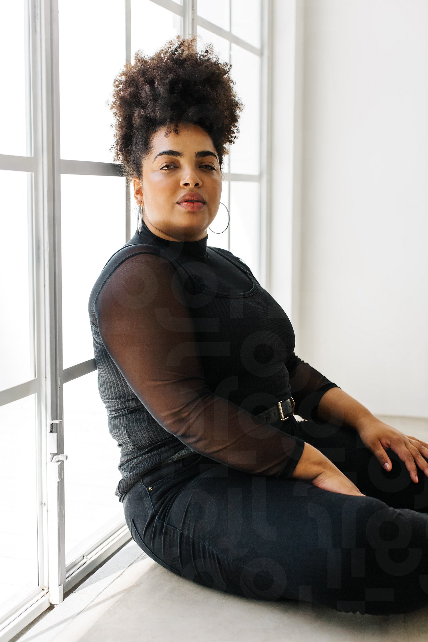 Fashionable woman sitting by a window and looking at camera. Female in black casual outfit sitting at window.