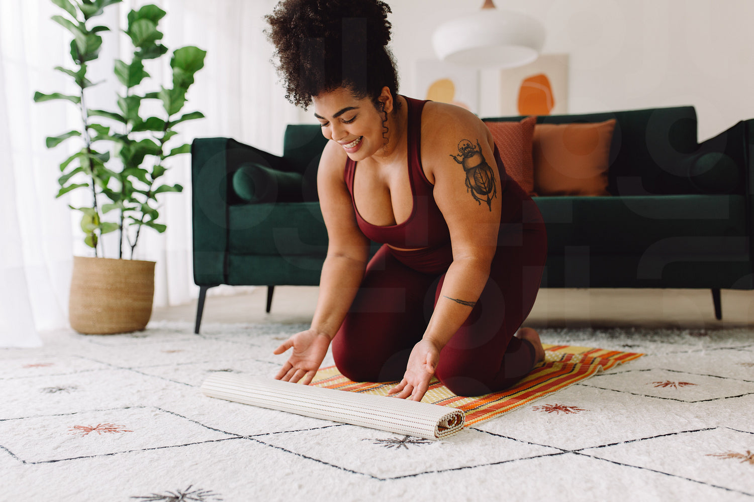 Body positive woman placing yoga mat on floor. Plus size female unfolding exercise mat at home.