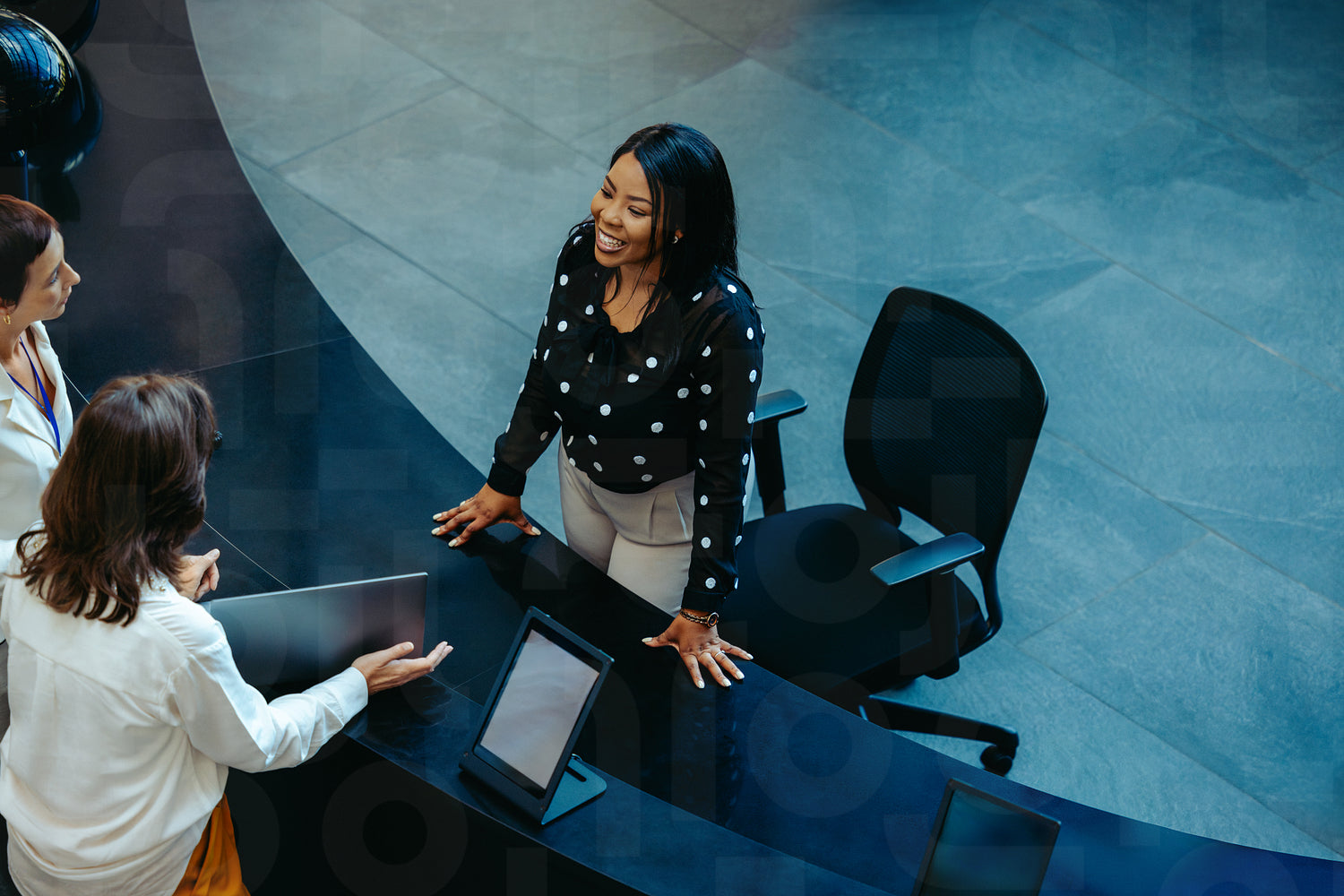 A friendly female receptionist interacts with colleagues at a modern office building's reception desk. She is smiling and engaged, creating a welcoming atmosphere.