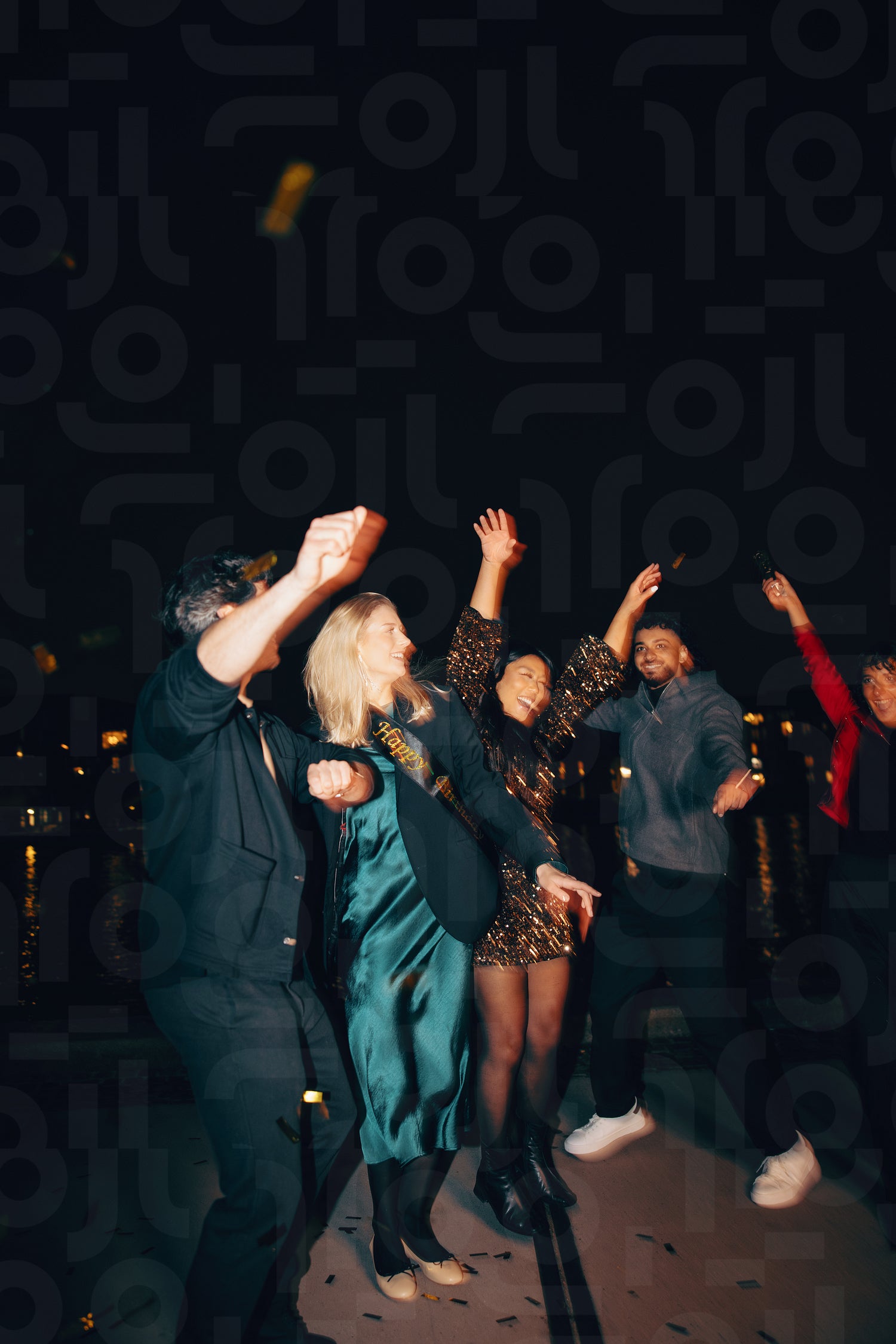 A group of friends enjoying a festive celebration at night, dancing and smiling joyfully.