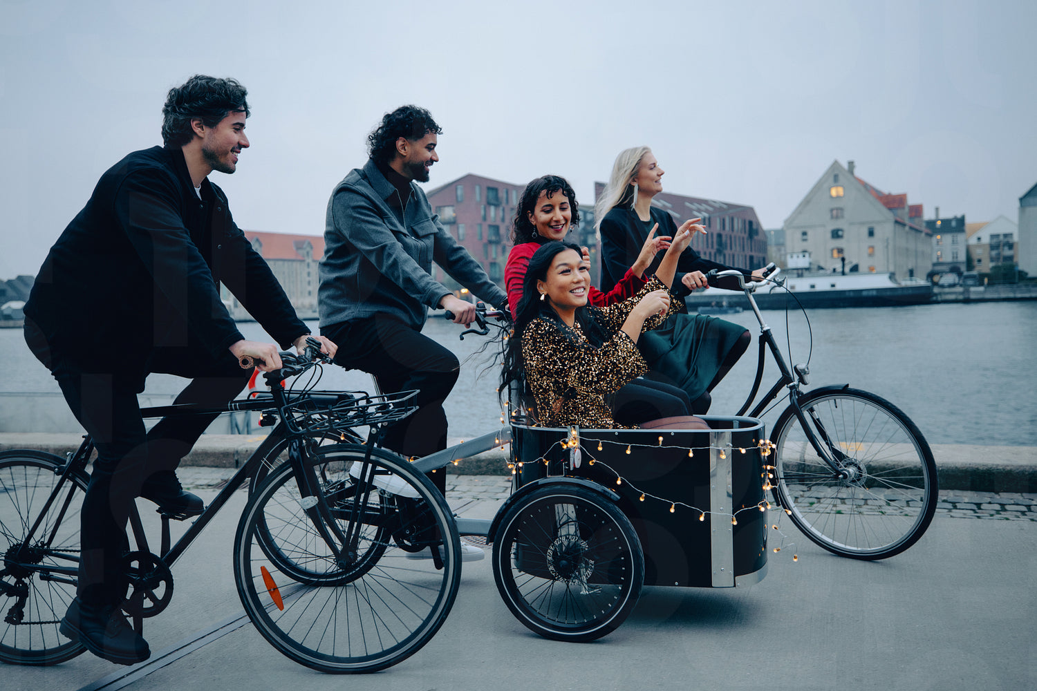 Friends enjoying a fun bike ride together in a scenic urban setting