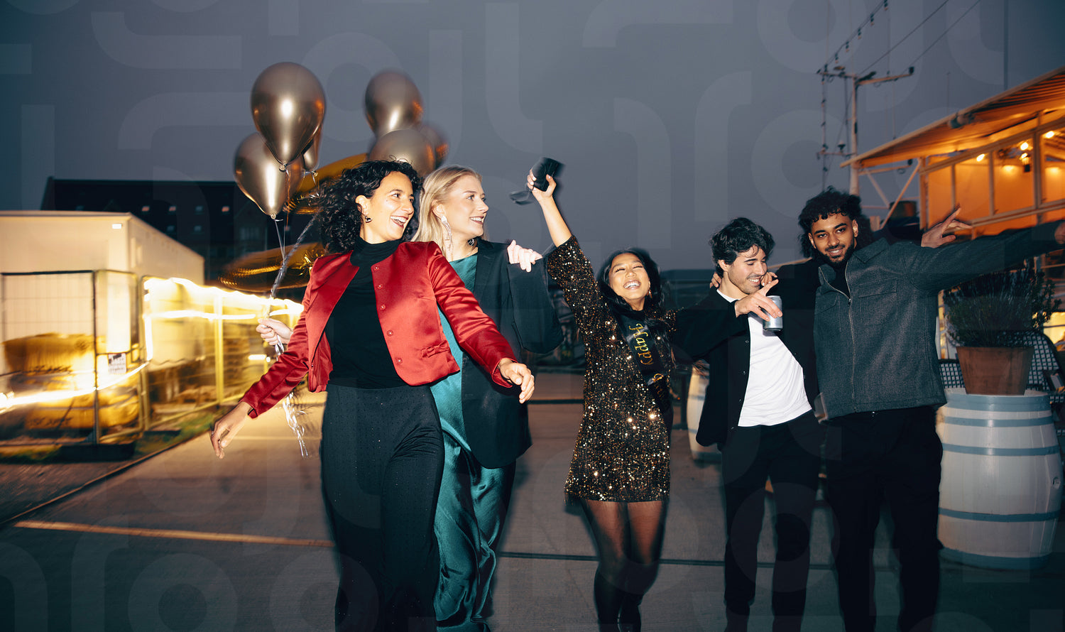 A lively group of friends celebrating together outdoors during the evening, enjoying festivities with enthusiasm and laughter. Perfect image for themes of celebration, joy, and companionship.