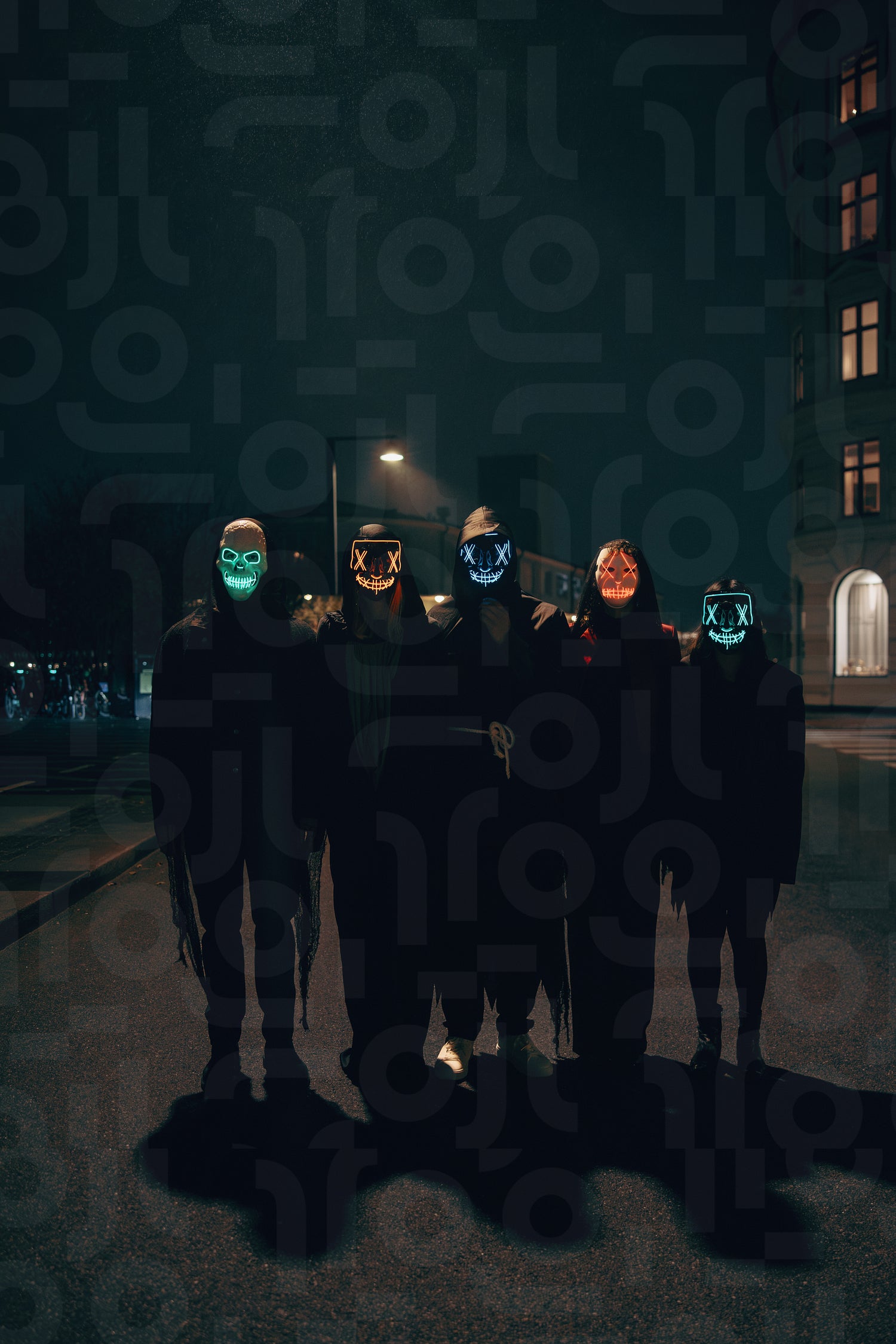 A group of people wearing glowing illuminated masks stands on a dark city street at night, featuring colorful lights and shadows for an eerie and mysterious atmosphere.