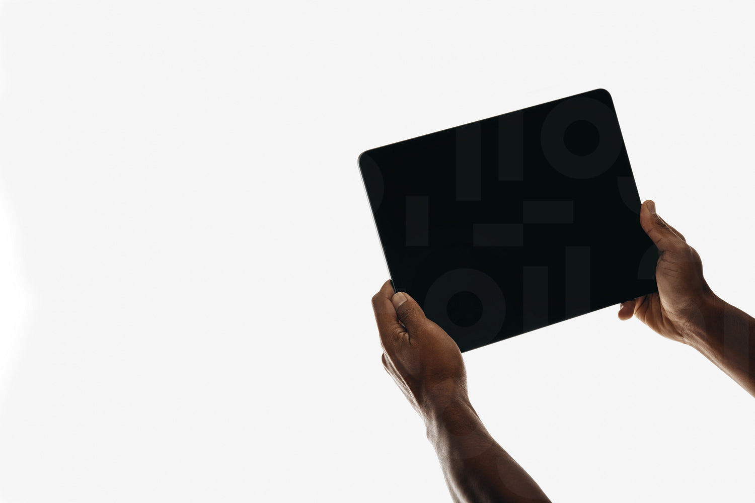 Hands holding a tablet with a blank screen on a plain white background