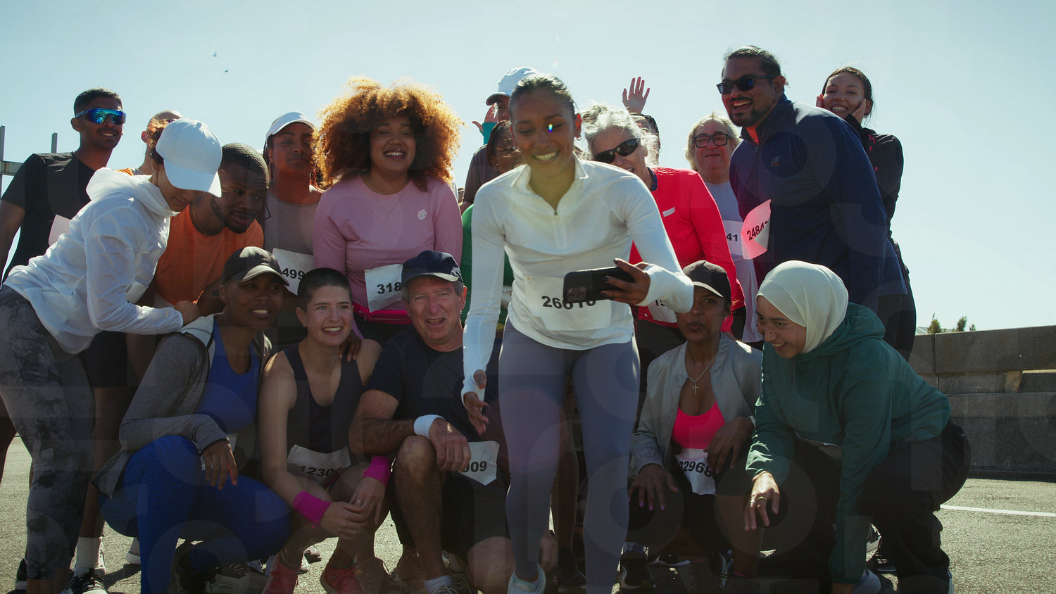 A group of joyful runners captures a memorable moment together with a selfie after completing their race, showing their happiness and camaraderie.