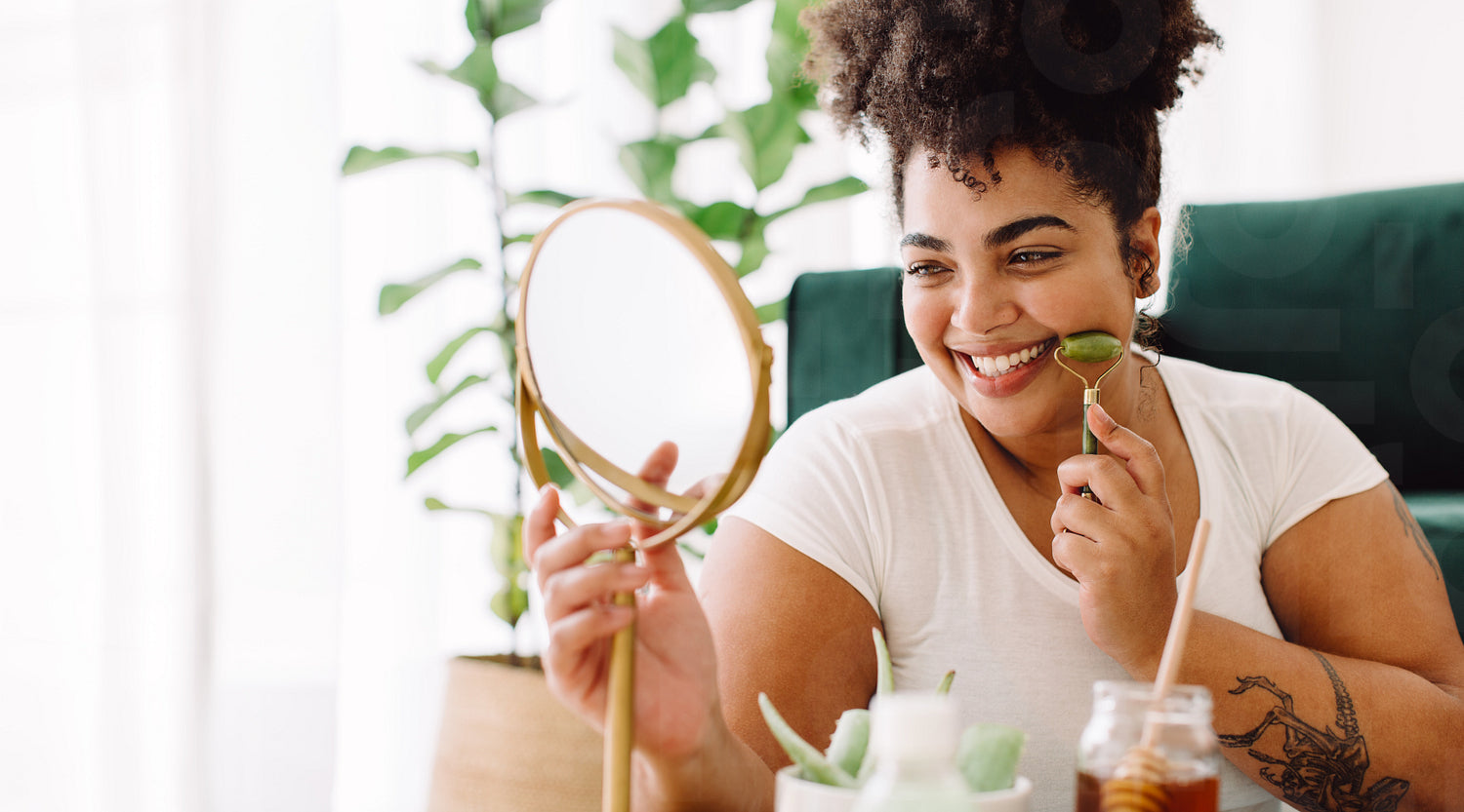 Pretty woman taking care of facial skin by using massage tools while looking at mirror. Female doing routine self care at home.