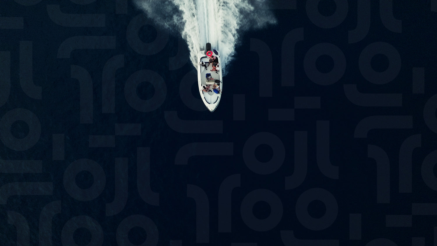 An impressive aerial shot captures a motorboat speeding across vast blue waters, leaving a long white wake. The vessel carries passengers, highlighting travel and summer activities.