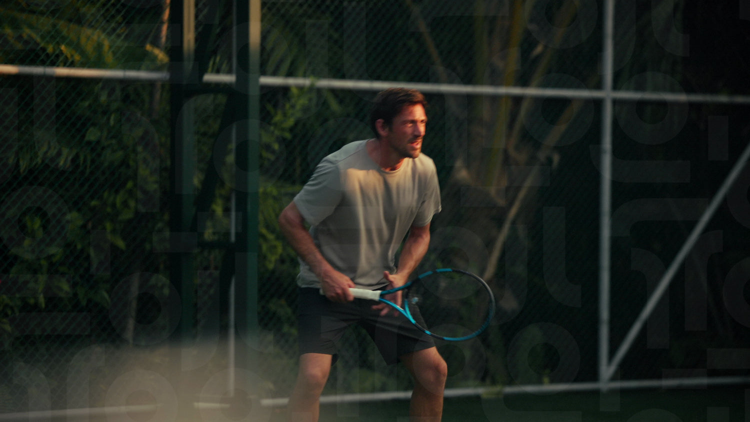 Man playing intense tennis game, demonstrating active and dynamic sports fitness