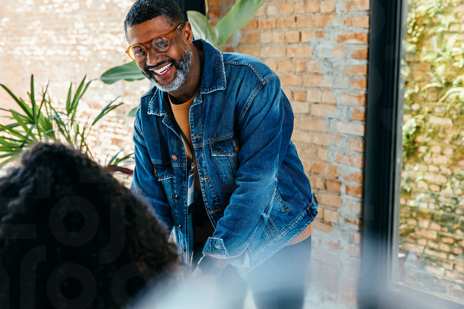 Mature businessman enjoying a cheerful conversation in a casual office setting with natural light