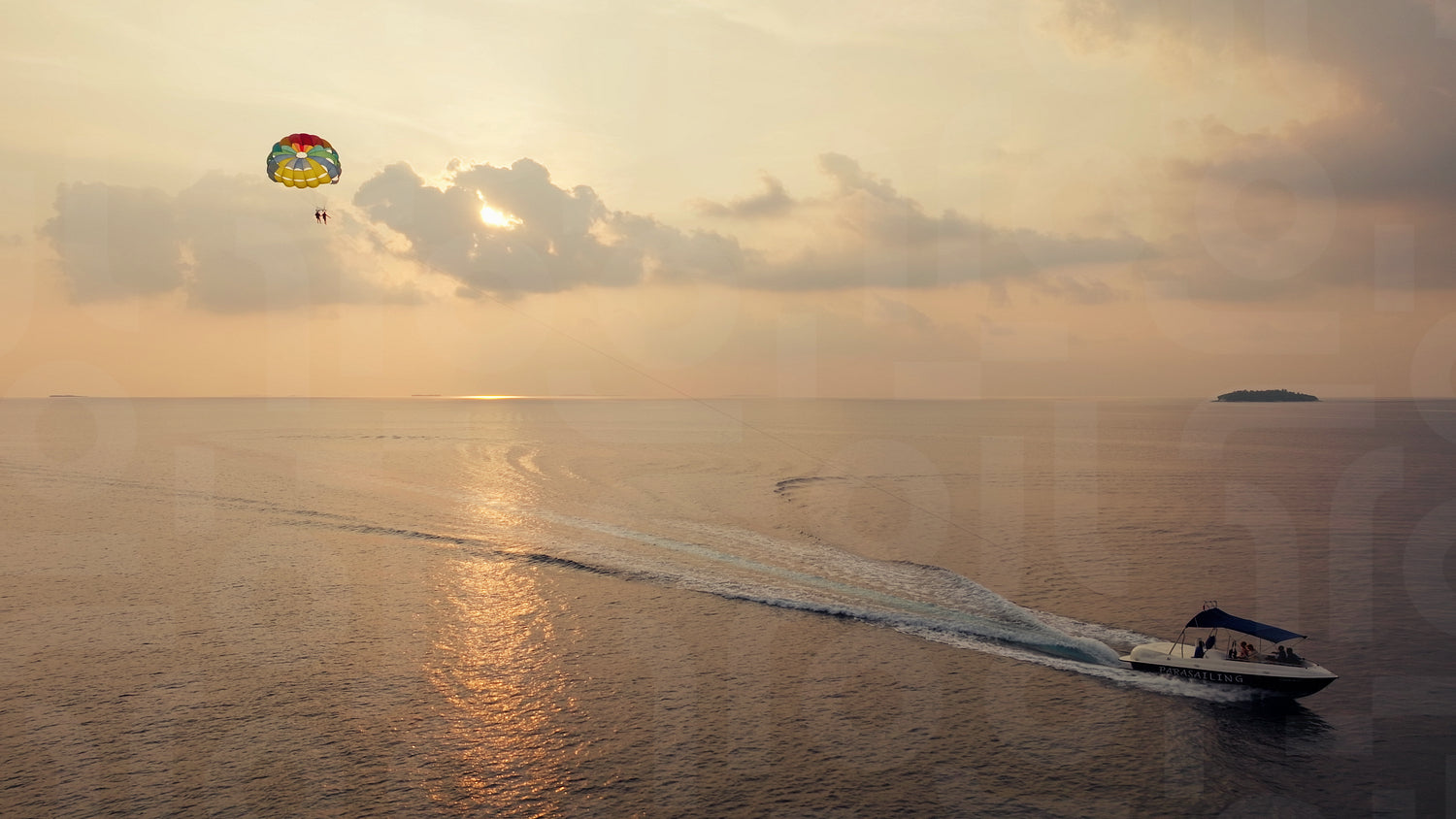 A person parasailing over a beautiful ocean at sunset, towed by a boat, with the sun reflecting on the calm water near a serene tropical island. This offers an adventurous experience.