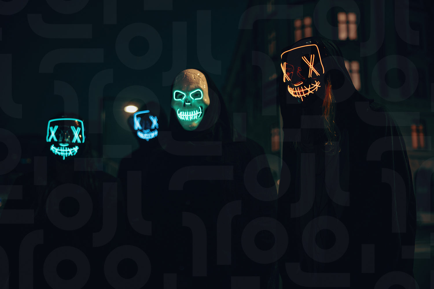 Group of individuals wearing brightly lit masks at night in an urban street environment, pseudonymously dressed.
