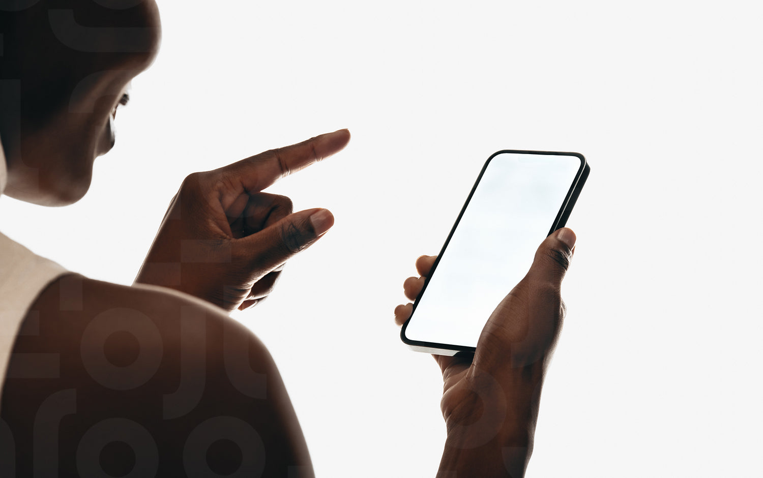 Close-up of hands making a zoom in/out gesture on a smartphone with blank screen, isolated on white background. Ideal for mobile app mockups, touchscreen interaction, and modern technology concepts.