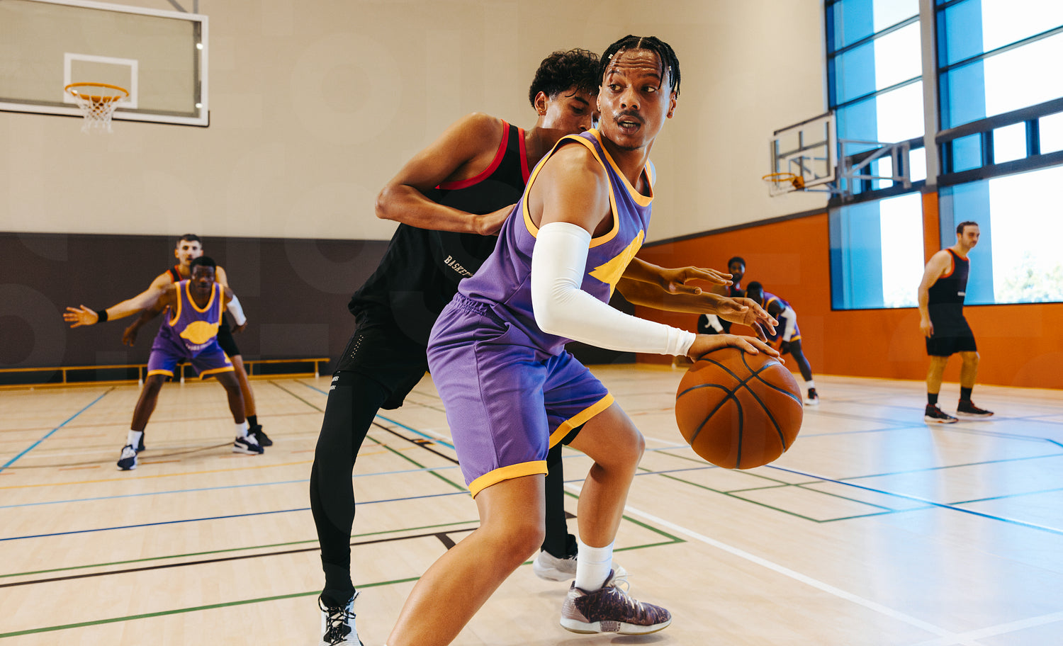 Players engaged in a competitive basketball game, showcasing teamwork, agility, and skill in an indoor court setting, emphasizing collaboration, athleticism, and the dynamic energy of the game.