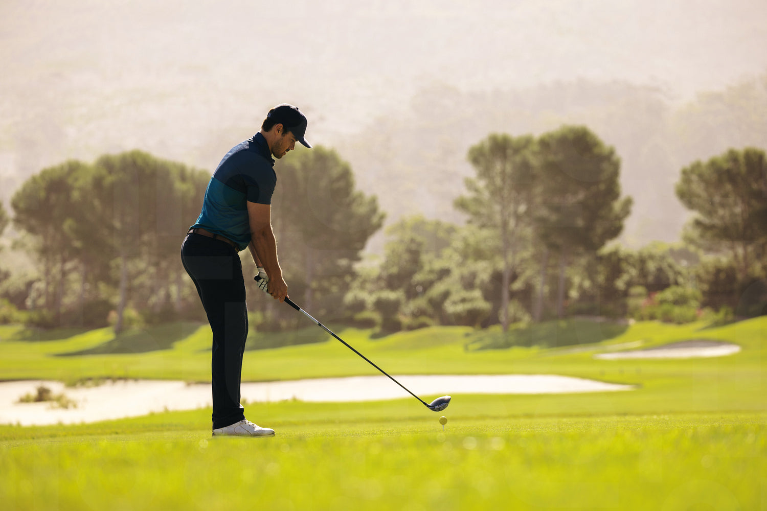 Professional golfer prepares for a powerful tee shot near a sand bunker, focusing intently on the challenging golf course ahead