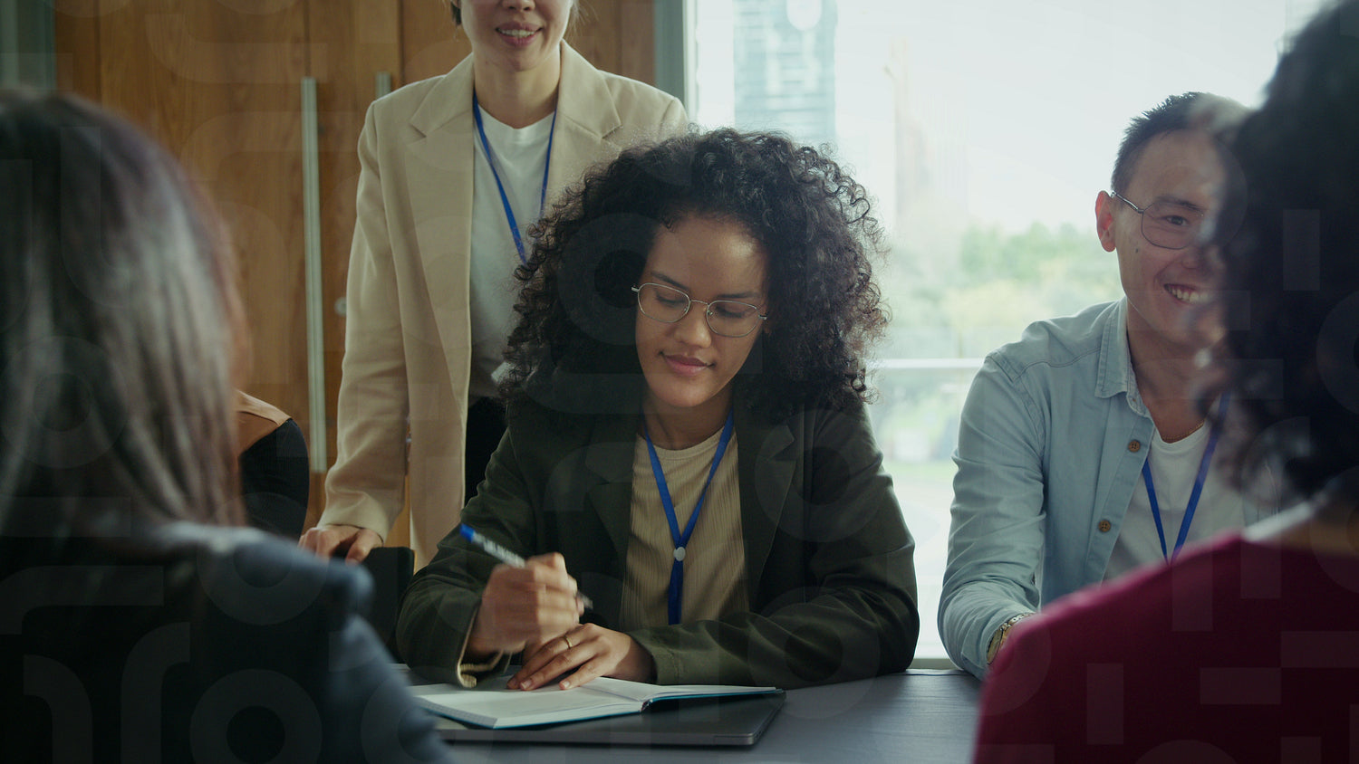 People are gathered in a room for a business meeting or conference. An attentive woman takes notes while others listen, fostering a collaborative atmosphere.