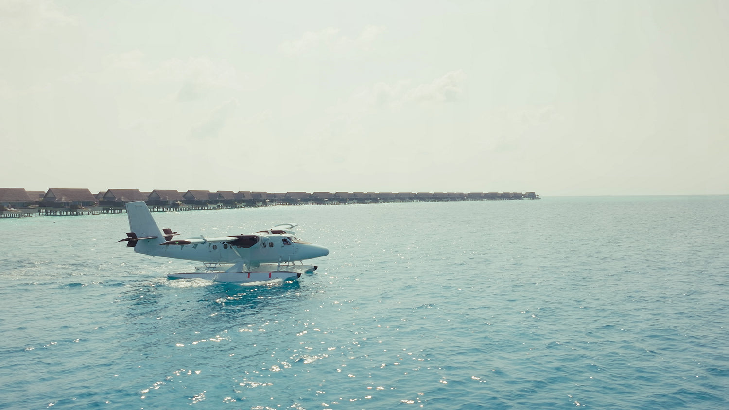 Seaplane taxiing on turquoise ocean near overwater villas at tropical resort