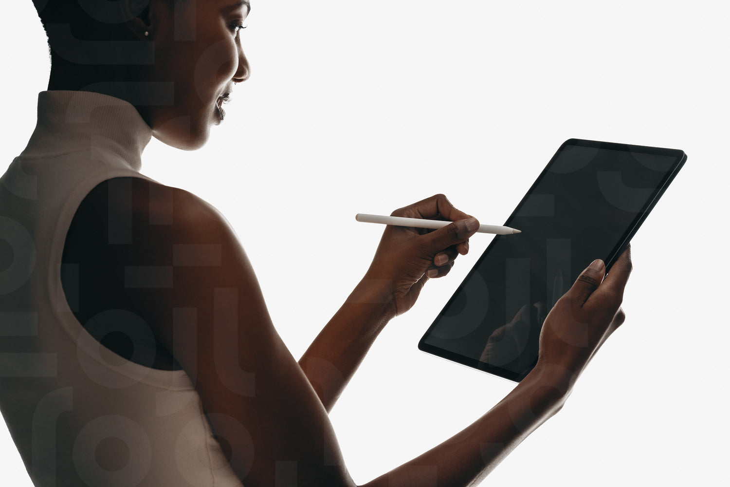 Side view of woman using stylus with tablet in minimalist setting