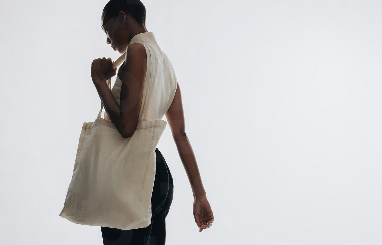 Stylish model showcasing a blank beige tote bag in a soft-lit minimalist studio. Ideal for eco-luxury branding, high-end fashion campaigns, and premium sustainable retail concepts.