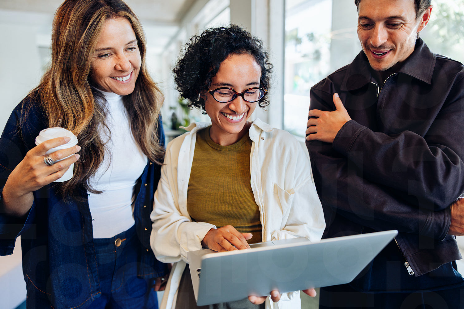 Team collaboration around a laptop in modern office