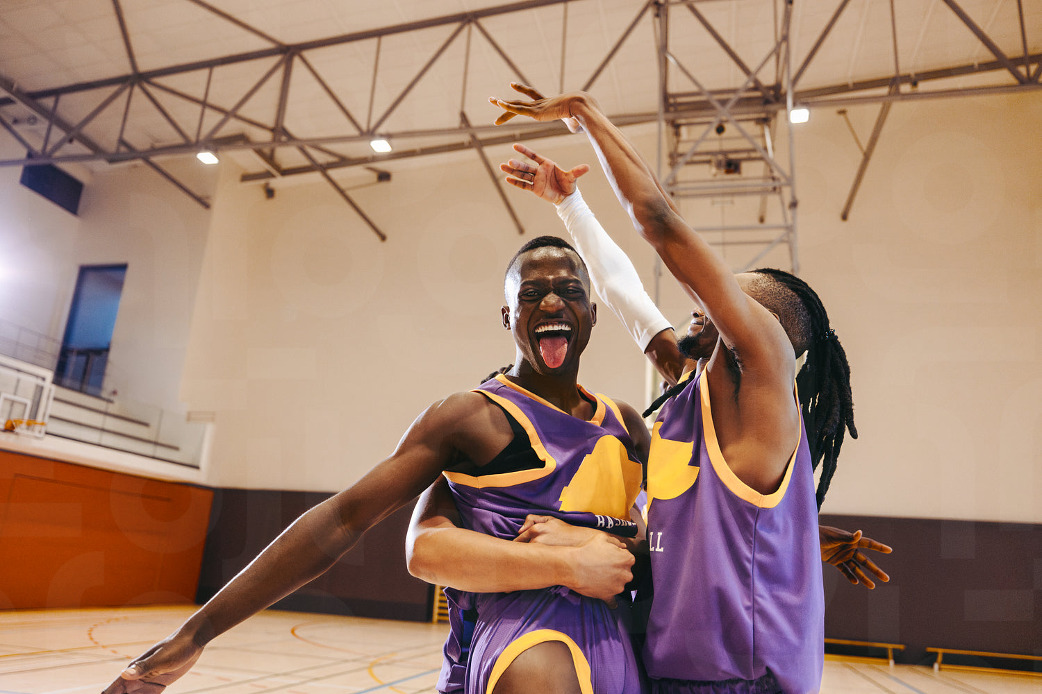 Group of young male basketball players celebrating victory on an indoor court, expressing excitement, teamwork, and joy. Emphasizing athleticism, sportsmanship, and youthful energy in dynamic action.