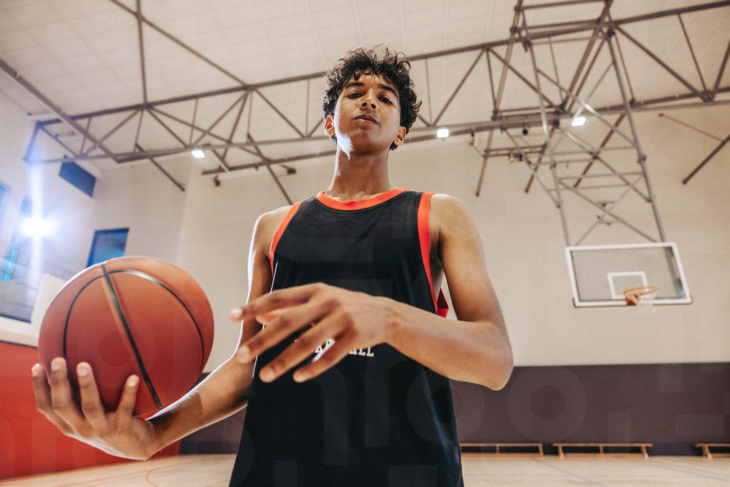 Young male basketball player spinning a basketball in an indoor gym, exemplifying determination, athletics, and focus in a sports setting.