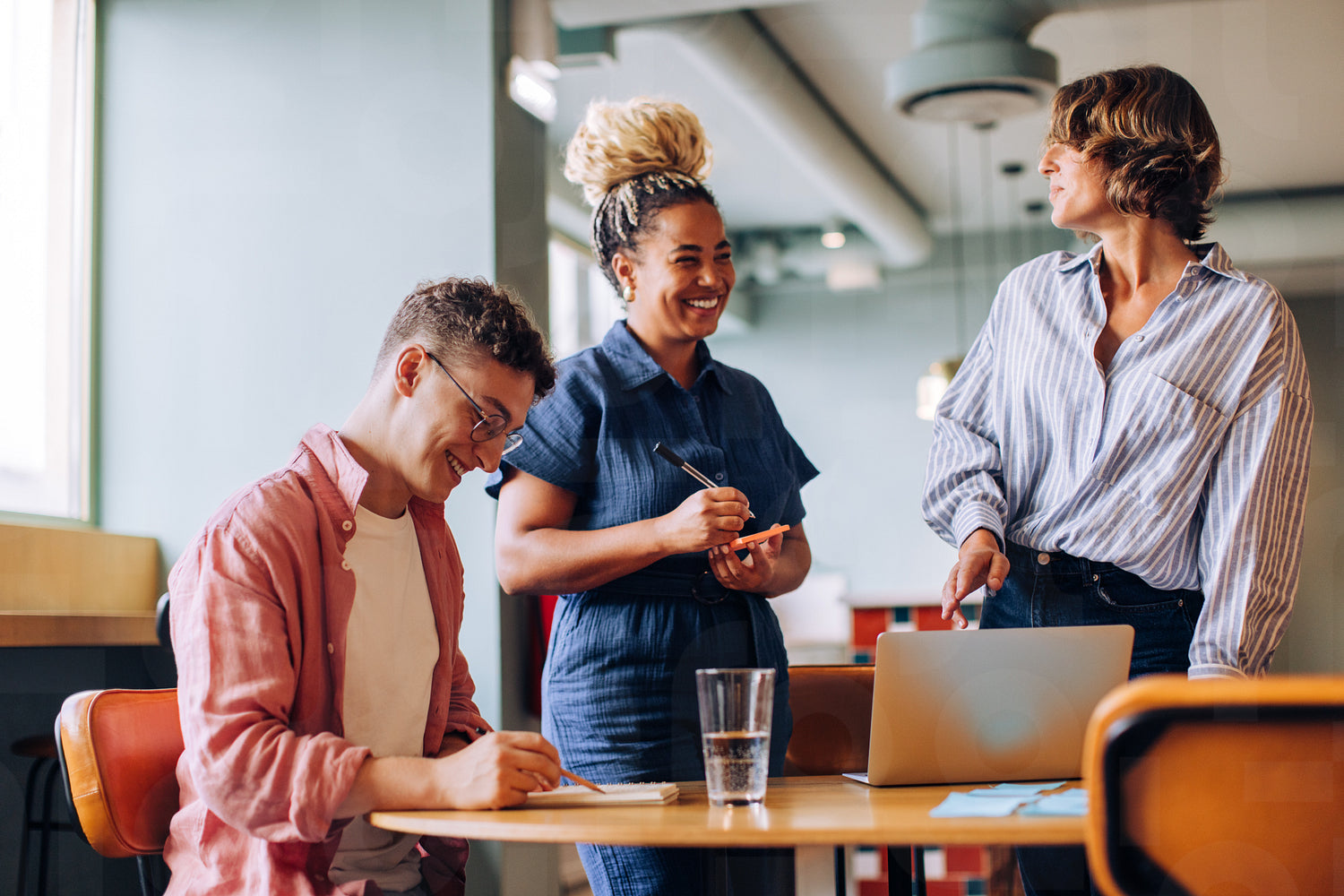 Three friendly coworkers of varying ages share ideas during a casual meeting at the office. They smile and interact openly around a table with notes and a laptop, displaying joy and teamwork.