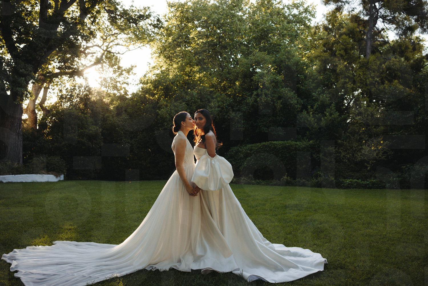 Two brides share an intimate moment outdoors during golden hour