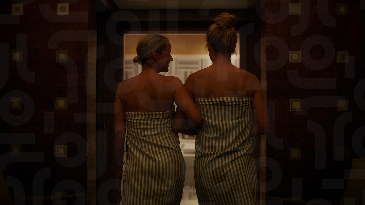 Two women wrapped in towels walk into a luxurious and serene hammam. They hold hands, anticipating a relaxing and pampering spa experience, highlighting togetherness and wellness.