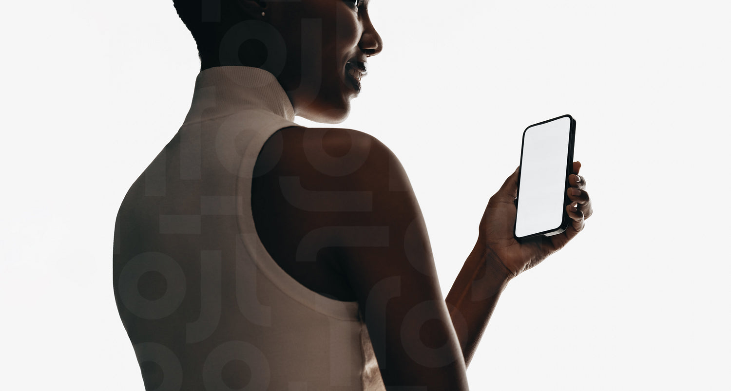 Close-up side view of a woman holding a smartphone with blank screen, isolated on white. Perfect for app and UI mockups, technology presentations, and creative digital projects.