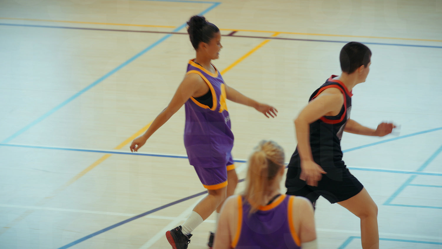 Young athletes playing basketball on court