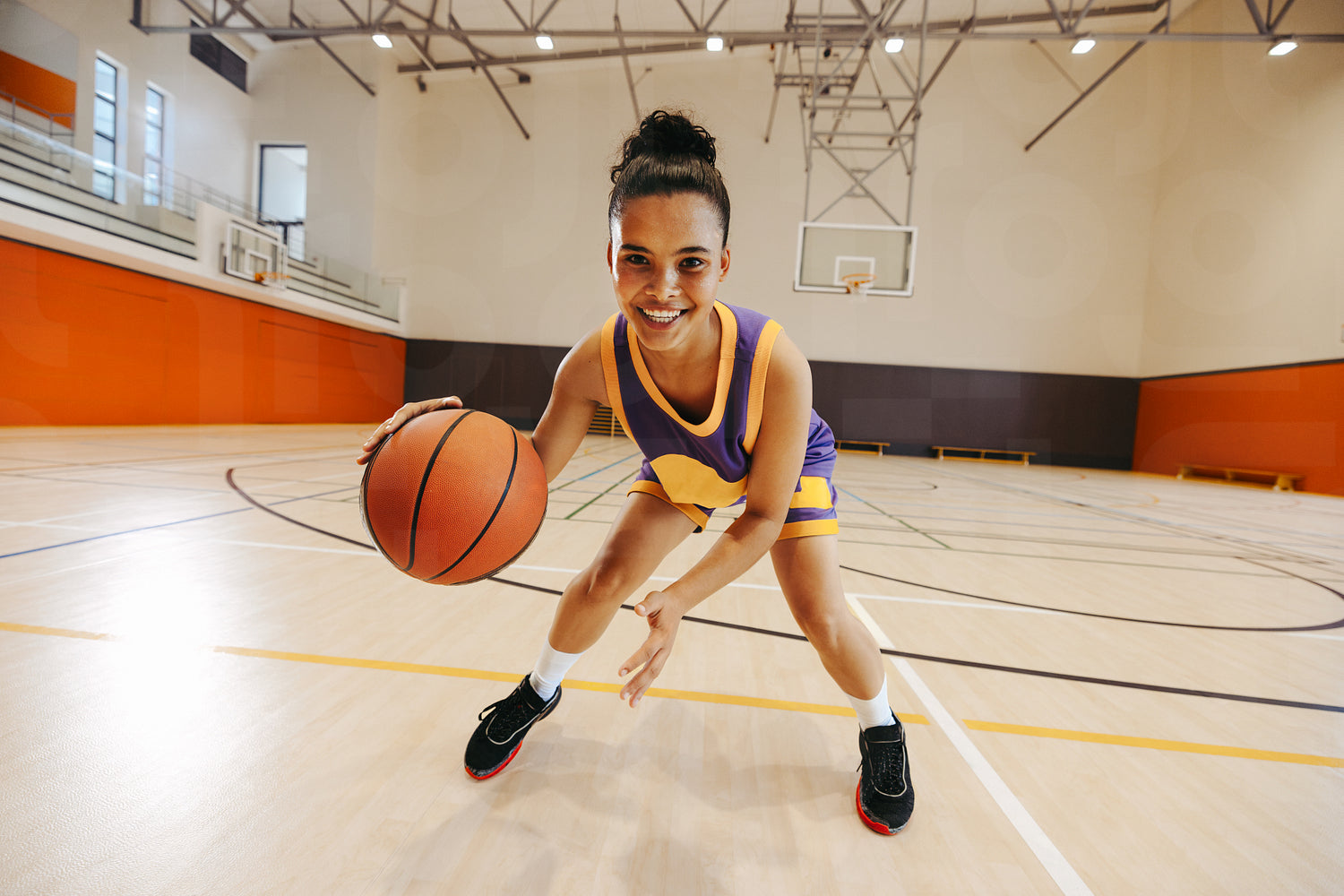 A confident young basketball player demonstrates dribbling techniques during training in a gymnasium. The well-lit indoor court provides a professional setting for skill improvement and training.