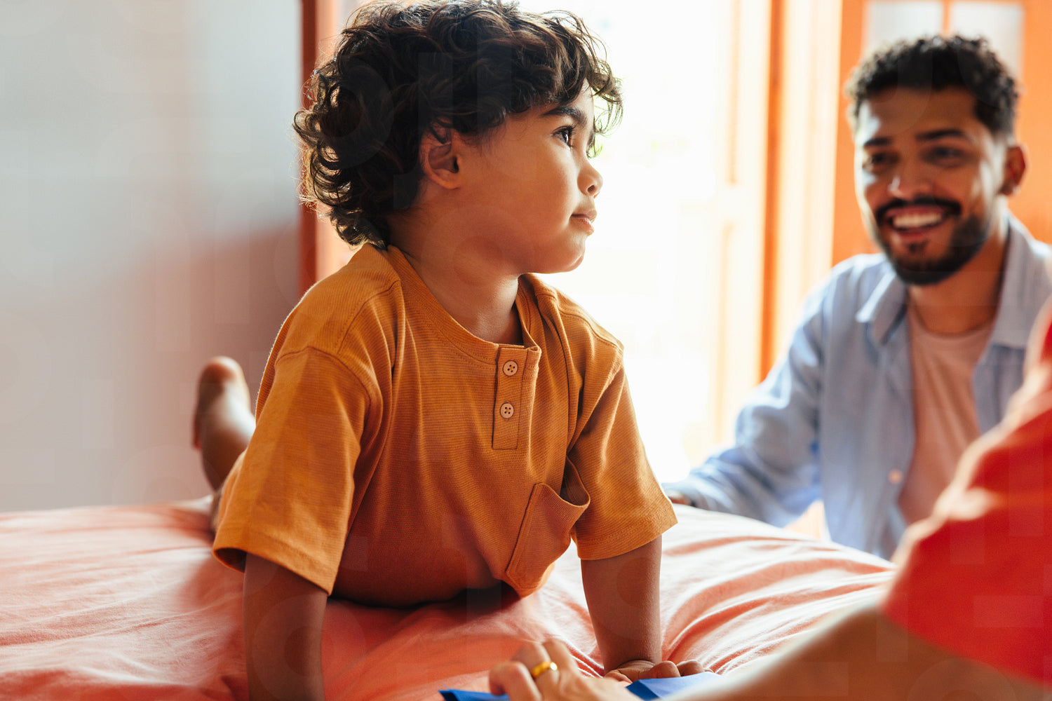 A child wearing a comfortable outfit lies on a bed while an adult shares a moment, creating a warm and cheerful family atmosphere in a cozy home interior.