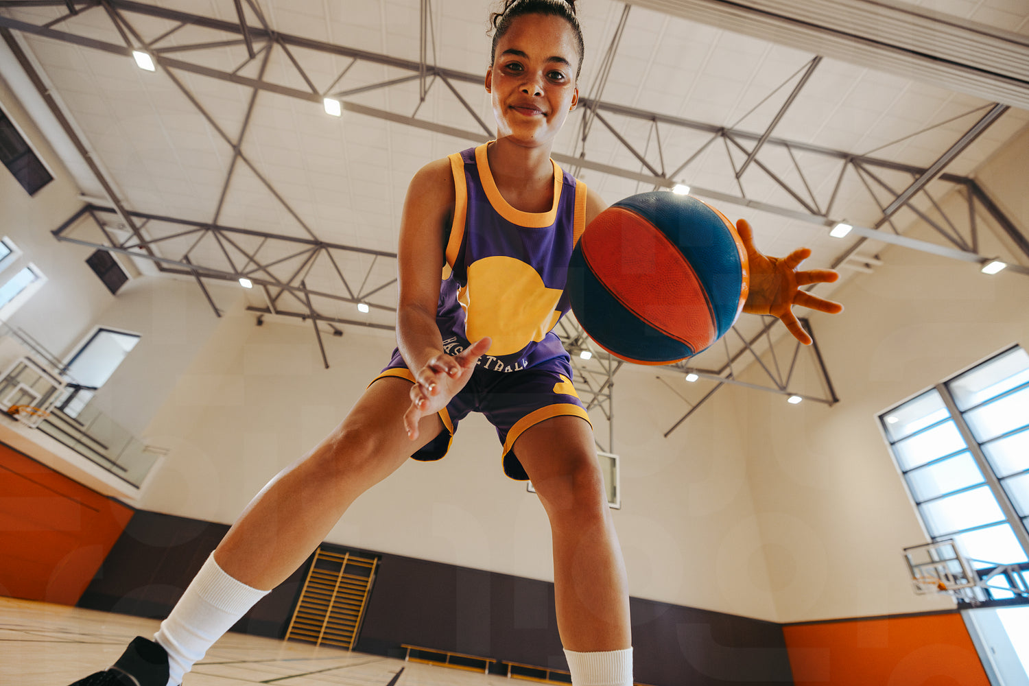 Young female athlete dribbling basketball in a spacious recreational gymnasium