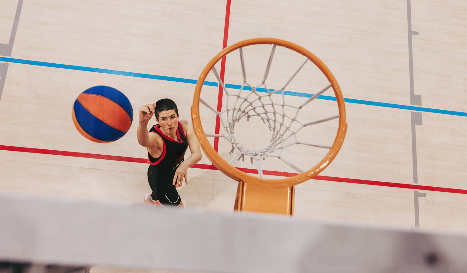 Female basketball player shoots the ball towards the hoop in an indoor sports gym. Captured from an overhead perspective, showcasing the action and dynamics of the sport during a game or practice.