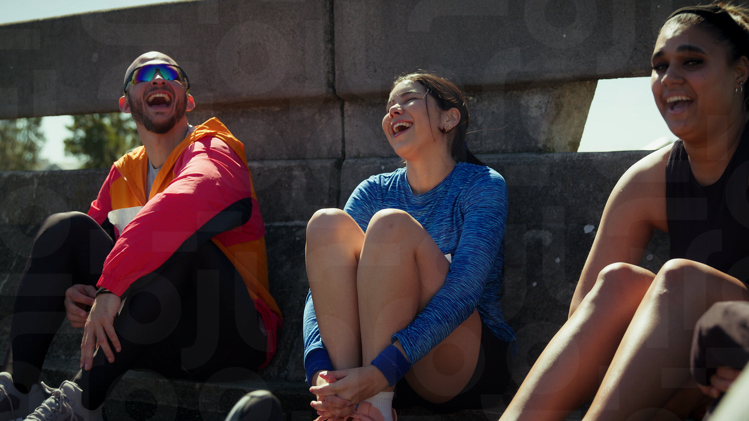 Young friends share laughter and conversation while sitting outdoors after a run. They are happy and relaxed, enjoying each other's company and positive vibes.