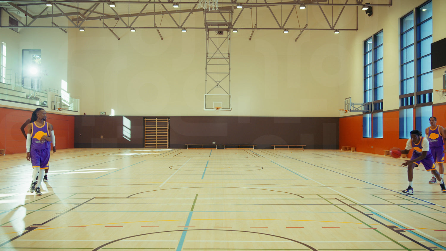 An athletic young man actively plays basketball indoors. He skillfully dribbles, jumps, and shoots the ball, scoring a perfect hoop. The scene captures dynamic sports action and youth.