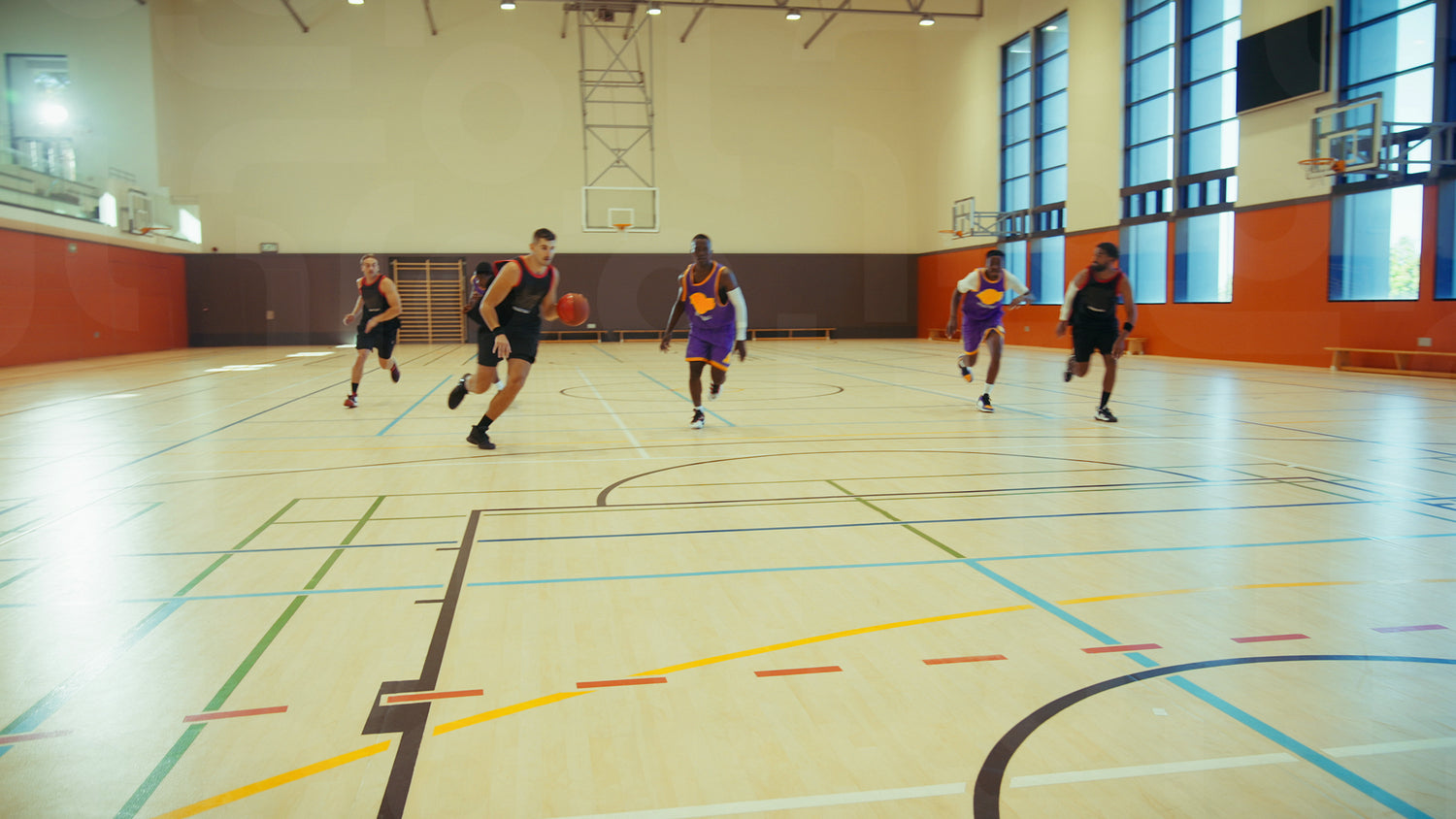 A diverse group of young men vigorously play basketball on an indoor court, showcasing athletic skill and teamwork. One player makes an impressive dunk.