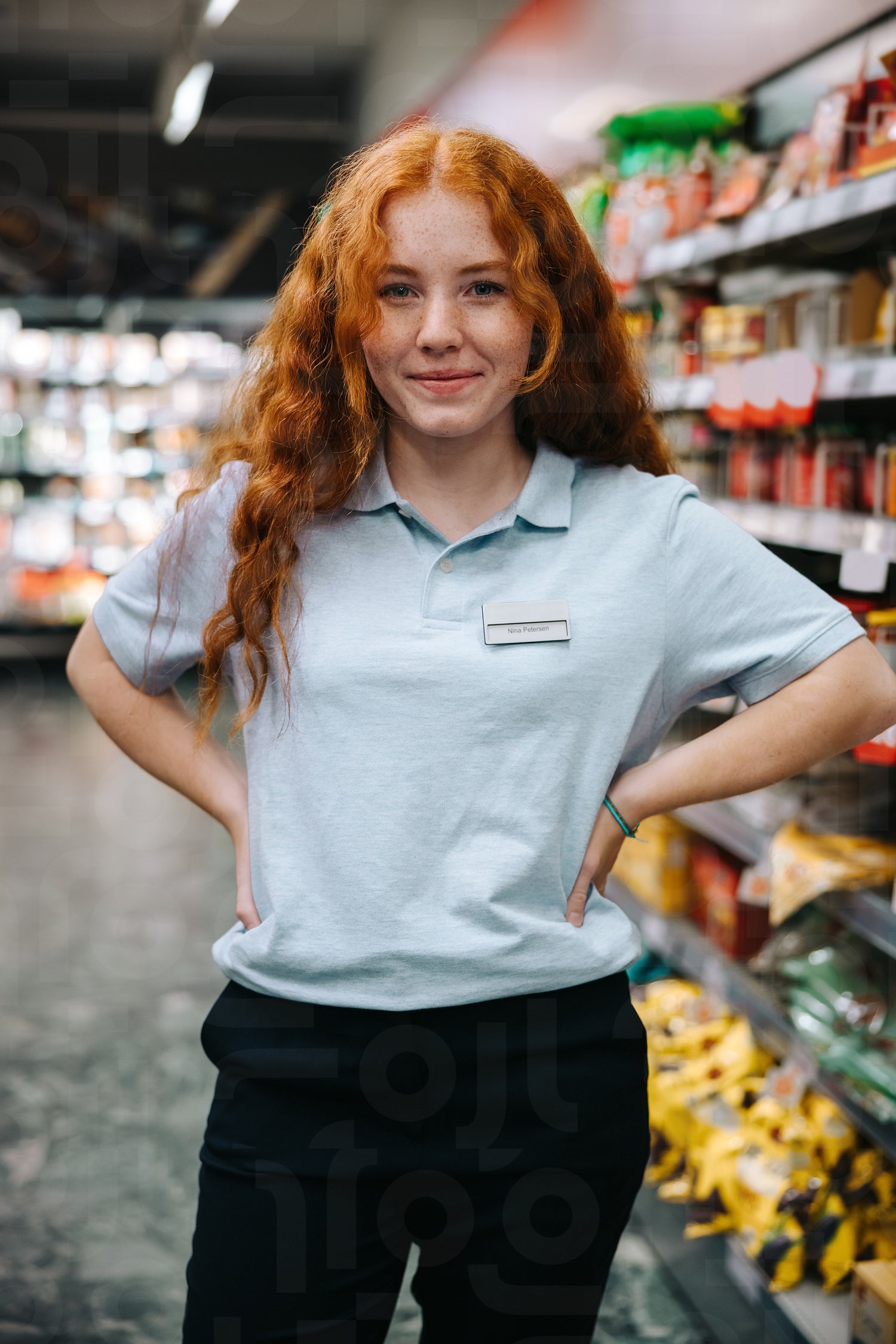 Caucasian female employee at work in supermarket. Woman on uniform standing in grocery store with her hands on hips and looking at camera.