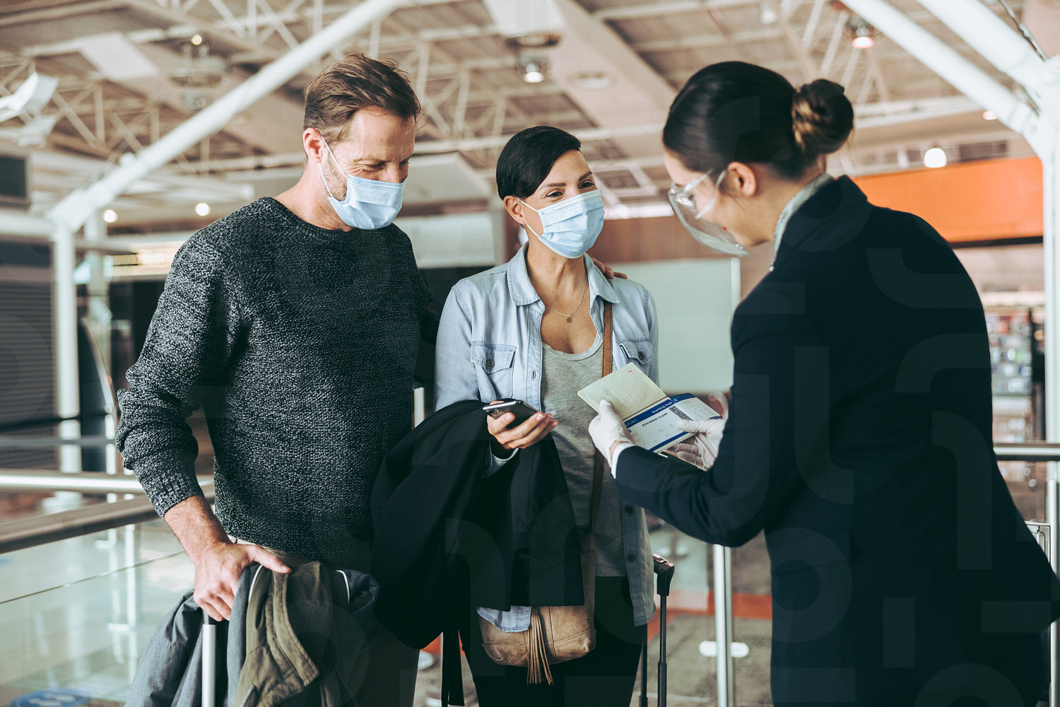 Man and woman with airlines staff at boarding gate of airport during pandemic. Flight attendant checking boarding pass and passport of tourist couple during pandemic.