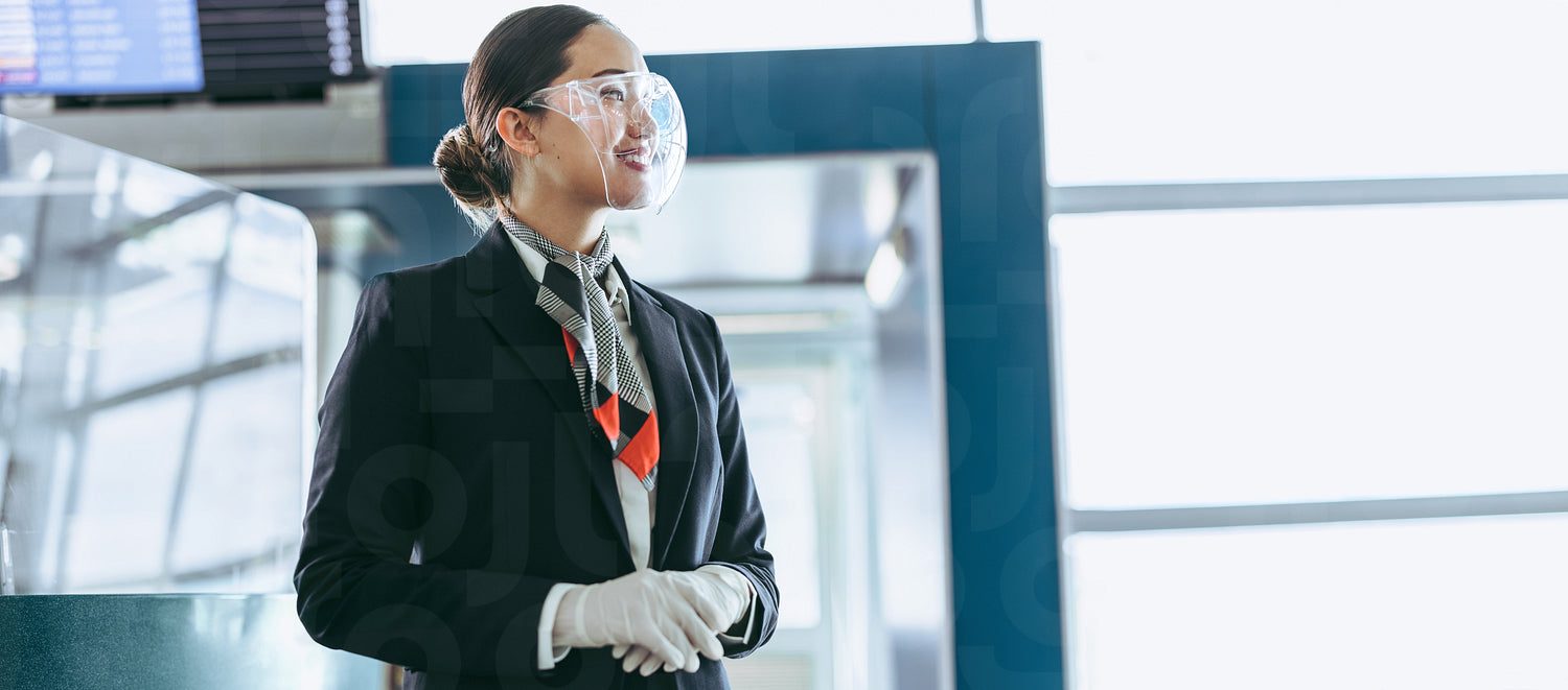 Side view of airline staff in face shield standing at airport. Airport attendant at terminal during pandemic waiting for tourists.