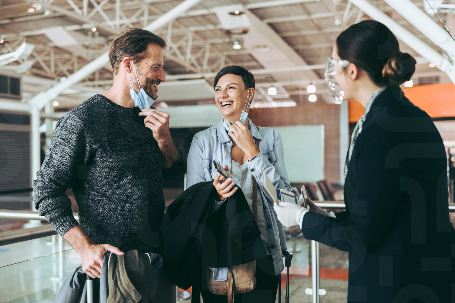 Man and woman pulling face masks for identification at check-in counter of airport during pandemic. Flight attendant assisting tourist couple at airport check in counter.