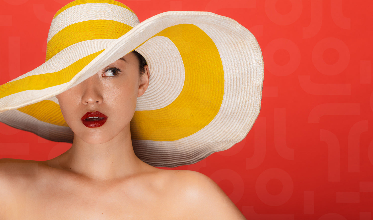 Close up portrait of attractive young asian woman wearing summer hat staring at side against red background.